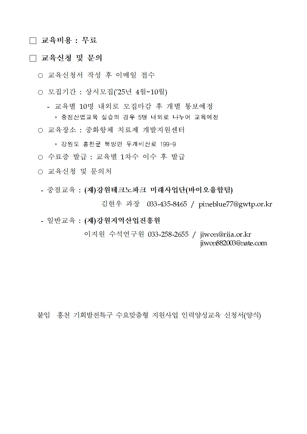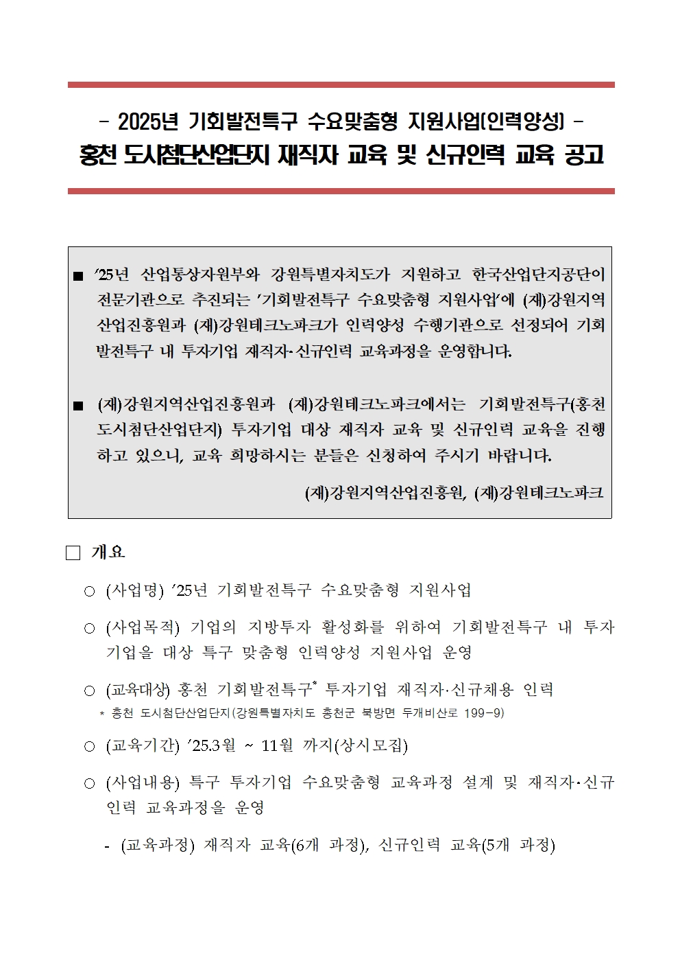 [2025년 기회발전특구 수요맞춤형 지원사업] 홍천 도시첨단산업단지-재직자 및 신규인력 교육 공고