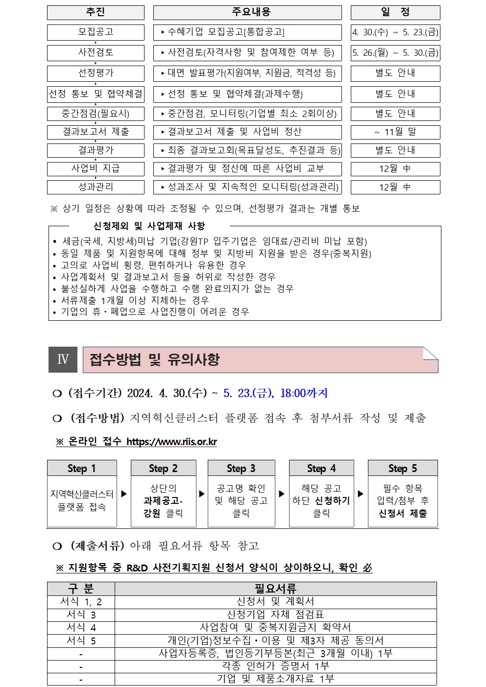 - www.riis.or.kr 접속 → “[강원] 지역혁신클러스터육성(비R&D) 기업지원사업 모집 공고” 선택 → “신청하기” 클릭 후 접수 진행