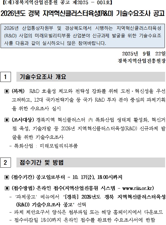 2026년도 경북 지역혁신클러스터육성(R&D) 기술수요조사 공고