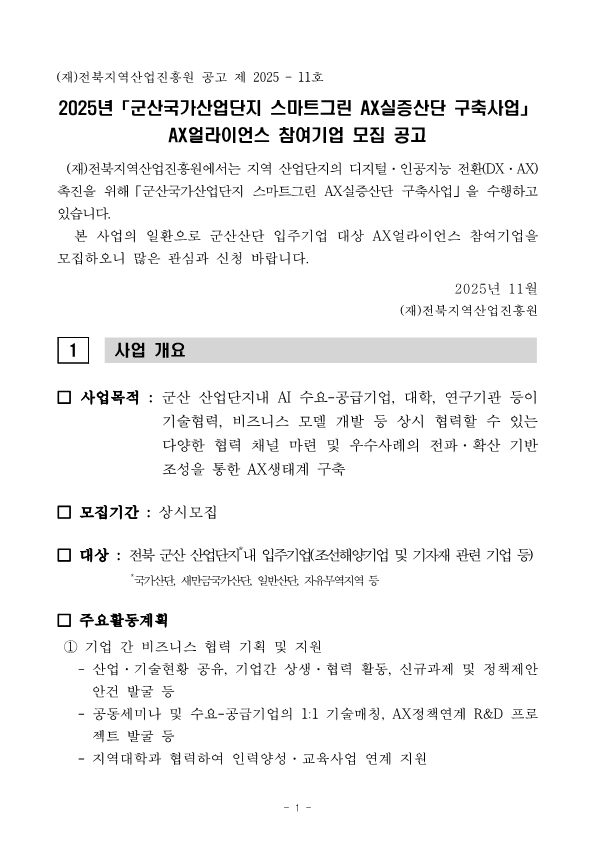 2025년「군산국가산업단지 스마트그린 AX실증산단 구축사업」 AX얼라이언스 참여기업 모집 공고