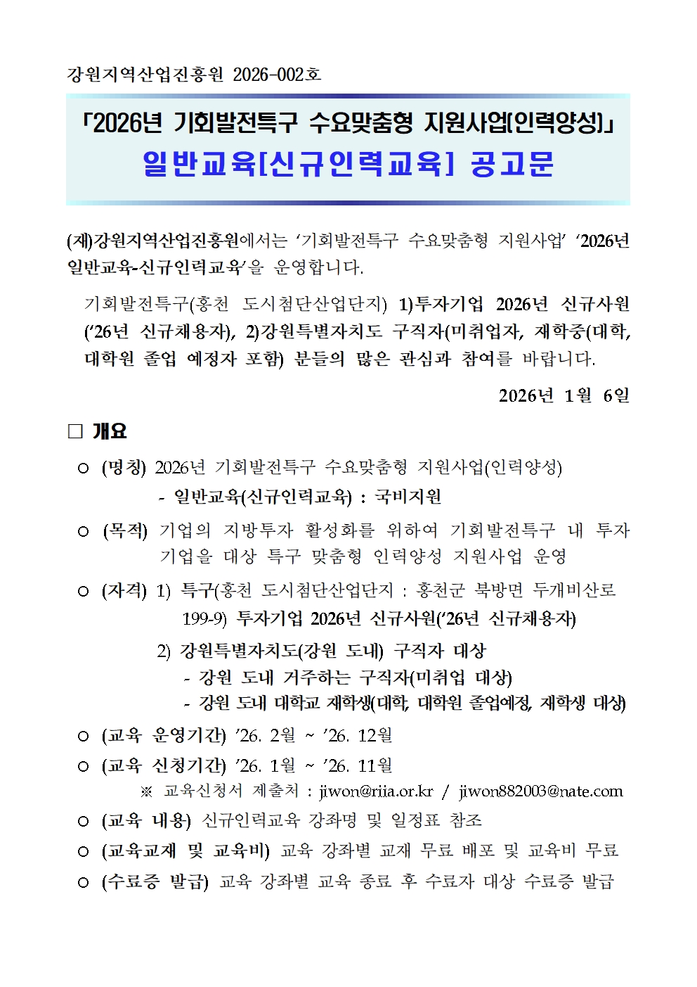[2026년 기회발전특구 수요맞춤형 지원사업(인력양성)] 일반교육(신규인력 교육) 공고