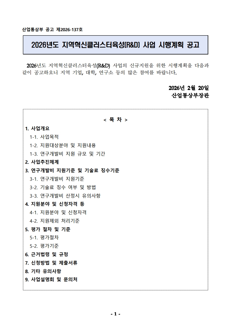 2026년 지역혁신클러스터육성(R&D) 사업 시행계획 공고